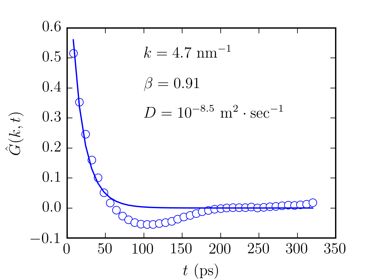 A contour plot and a 3D plot are generated as belows. Again, for benzene rings, as $k$ is small, it takes a longer time for the structure factor to decay to zero, and vice and versa for larger value of $k$. The 3D plot also makes this more obvious. At $k=4.7~\mathrm{nm^{-1}}$, $\hat{G}(k,t)$ is fitted to a stretched exponential function with the following form: \begin{equation} \exp\Big[-(k^2Dt)^{\beta}\Big] \end{equation} where $\beta$ is an indication of the non-linearity of the system, i.e. the lower the value of $\beta$, the higher the non-linearity of the system. In this case, it was found that $\beta=0.91$ and $D=10^{-8.5}~\mathrm{m^2\cdot sec^{-1}}$. The calculated value of diffusivity in this example is in agreement with that of the experimental value, which should be around $10^{-8.6}~\mathrm{m^2\cdot sec^{-1}}$ at $300$K. To reiterate, the dynamic structure factor, which is expressed as $\hat{G}(k,t)=\hat{S}(k,t)=\hat{\omega}(k,t)+\rho\hat{h}(k,t)$, consists of the intramolecular ($\hat{\omega}(k,t)$) and intermolecular ($\hat{h}(k,t)$) part.