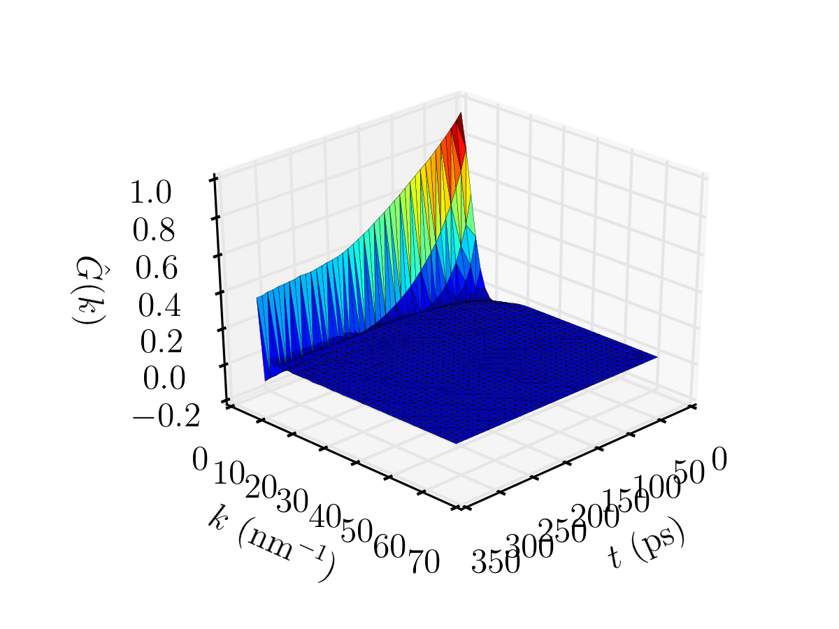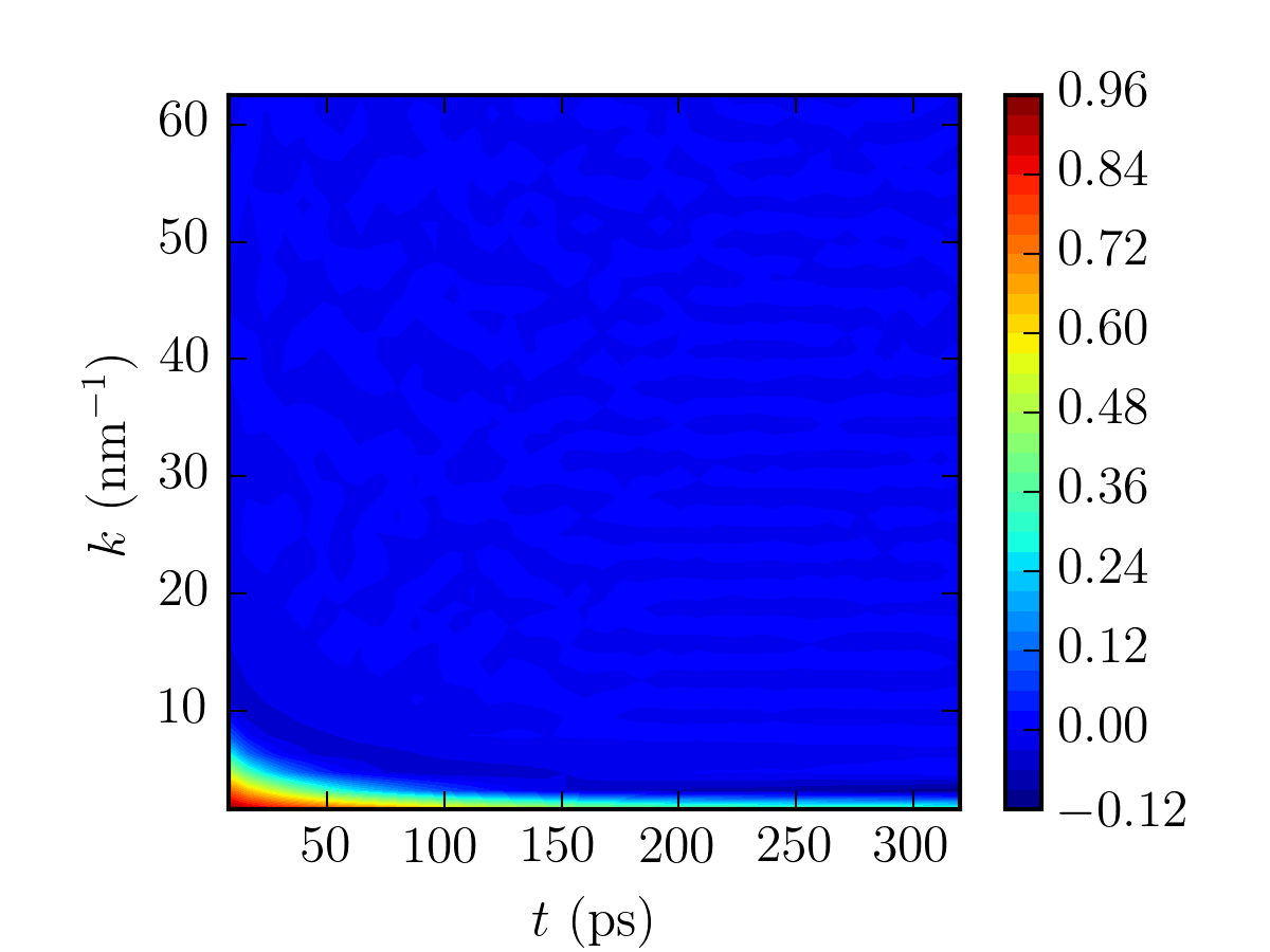 A contour plot and a 3D plot are generated as belows. Again, for benzene rings, as $k$ is small, it takes a longer time for the structure factor to decay to zero, and vice and versa for larger value of $k$. The 3D plot also makes this more obvious. At $k=4.7~\mathrm{nm^{-1}}$, $\hat{G}(k,t)$ is fitted to a stretched exponential function with the following form: \begin{equation} \exp\Big[-(k^2Dt)^{\beta}\Big] \end{equation} where $\beta$ is an indication of the non-linearity of the system, i.e. the lower the value of $\beta$, the higher the non-linearity of the system. In this case, it was found that $\beta=0.91$ and $D=10^{-8.5}~\mathrm{m^2\cdot sec^{-1}}$. The calculated value of diffusivity in this example is in agreement with that of the experimental value, which should be around $10^{-8.6}~\mathrm{m^2\cdot sec^{-1}}$ at $300$K. To reiterate, the dynamic structure factor, which is expressed as $\hat{G}(k,t)=\hat{S}(k,t)=\hat{\omega}(k,t)+\rho\hat{h}(k,t)$, consists of the intramolecular ($\hat{\omega}(k,t)$) and intermolecular ($\hat{h}(k,t)$) part.