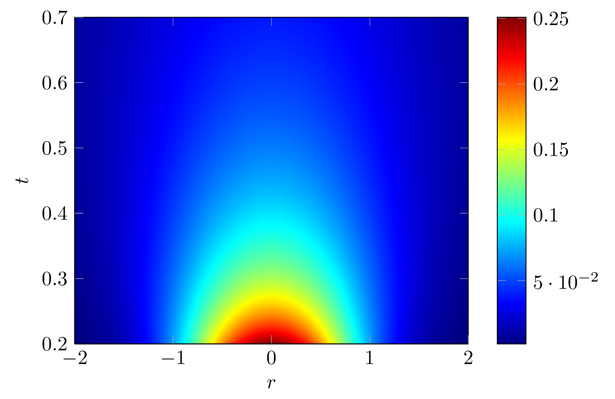 By the conservation of mass, continuity equation for non-uniform fluid with a number density of $c(\vec{r},t)$ can be written as: \begin{equation} \frac{\partial}{\partial t}c(\vec{r},t)=-\vec{\nabla}_{\vec{r}}\cdot c(\vec{r},t)\vec{v} \end{equation} A diffusive flux vector $\vec{j}=-D\vec{\nabla}_{\vec{r}} c$, where $D$ is the diffusion coefficient: \begin{equation} \frac{\partial}{\partial t}c = D\vec{\nabla}_{\vec{r}}^2c \end{equation} This can be solved using Fourier Transformation: \begin{equation} \hat{c}(\vec{k})=\int_{-\infty}^{\infty}e^{-i\vec{k}\cdot\vec{r}}c(\vec{r})d\vec{r} \end{equation} \begin{equation} c(\vec{r})=\frac{1}{8\pi^3}\int_{-\infty}^{\infty}e^{i\vec{k}\cdot\vec{r}}\hat{c}(\vec{k})d\vec{k} \end{equation} The R.H.S. of the diffusion equation is as follows: \begin{align} &\int_{-\infty}^{\infty}e^{-i\vec{k}\cdot\vec{r}}D\vec{\nabla}_{\vec{r}}^2 c(\vec{r})d\vec{r} \end{align} By integration by parts: \begin{align} &=i\vec{k}\cdot\int_{-\infty}^{\infty} D\vec{\nabla}_{\vec{r}} c(\vec{r})e^{-i\vec{k}\cdot\vec{r}}d\vec{r} \end{align} Again by integration by parts: \begin{align} &=-k^2\int_{-\infty}^{\infty}e^{-i\vec{k}\cdot\vec{r}}c(\vec{r})d\vec{r}=-k^2\hat{c}(\vec{k}) \end{align} \begin{align} \boxed{\hat{c}(\vec{k},t)=\hat{c}(\vec{k},0)e^{-k^2Dt}} \end{align} With the inital value $\hat{c}(\vec{k},0)=1$, we can transform $\hat{c}(\vec{k},t)$ back to the real space: \begin{align} c(\vec{r},t)=\frac{1}{2\pi^2}\int_0^{\infty}\frac{\sin kr}{kr}e^{-k^2Dt}k^2dk \end{align} $\frac{\sin(kr)}{kr}$ can be broken down into two terms using Euler formula: \begin{align} c(\vec{r},t)&=\frac{1}{2\pi^2}\int_0^{\infty}\Big[\frac{e^{ikr}-e^{-ikr}}{2ikr}\Big]e^{-k^2Dt}k^2dk\\ c(\vec{r},t)&=\frac{1}{4i\pi^2r}\int_0^{\infty}[e^{-k^2Dt+ikr}-e^{-k^2Dt-ikr}]kdk \end{align} \begin{align} \boxed{c(\vec{r},t)=\frac{e^{-\frac{r^2}{4Dt}}}{4i\pi^2r}\Big(\frac{ir\sqrt{\pi}}{2Dt\sqrt{Dt}}\Big)=\frac{1}{8\pi^{1.5}(Dt)^{1.5}}\exp\Big(-\frac{r^2}{4Dt}\Big)} \end{align}