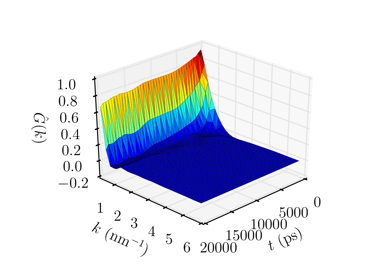 The van hove function is the time-dependent part of the dynamic structure factor, which tells us the probability of a particle having moved for a distance $r$ in a duration of $t$. When it is expressed in the fourier space, the relaxations of the chains at different length scales are revealed. The van hove function in fourier space has a maximum value of one and a minimum value of zero, which means 'not fully relaxed' and 'fully relaxed', respectively. For instance, from the MD trajectory of a polyethylene oxide melt, the van hove function can be calculated and transformed into the fourier space as shown in the contour plot of Figure 1. When $k\rightarrow 0$, where $k$ is the magnitude of the wavevector, it corresponds to the long length scale motion and vice and versa. The contour plot shows that when $k$ is small, the colour of the contour plot is mostly red in color, meaning that the motion is slow and the chains are not fully relaxed; as $k$ becomes large, the color of the contour plot turns blue in color, which indicates fast motion of the segments of chains. This contour plot allows us to extract transport properties of the polyethylene oxide melt, and to check how relaxed the system is.
