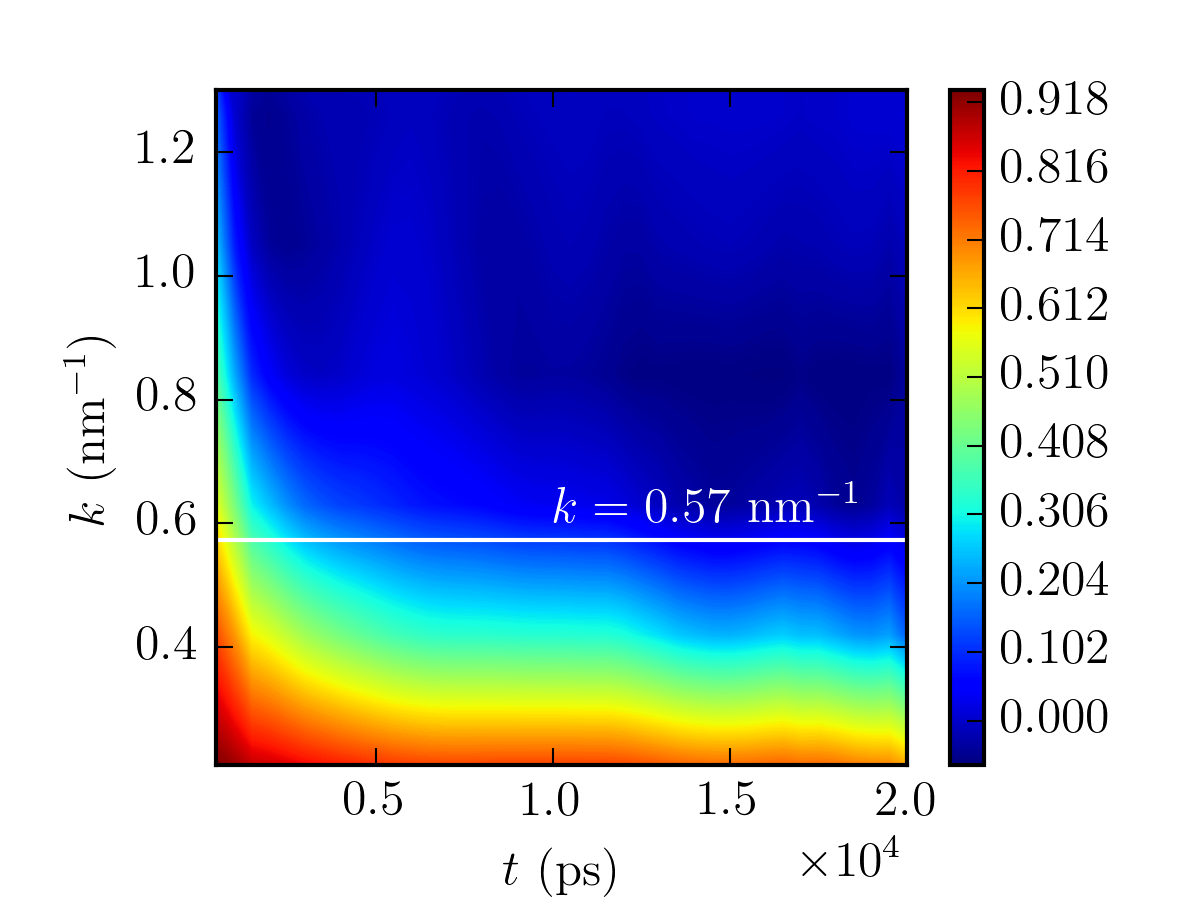 For instance, in this case, the root-mean-square radius of gyration of PEO chain is $1.745~\mathrm{nm}$. A line at $k=1/1.745=0.57~\mathrm{nm^{-1}}$ is drawn on the contour plot, which corresponds to the long length scale motion of the chain. Along the line, the height of the surface is almost zero, indicating that the system is relaxed.